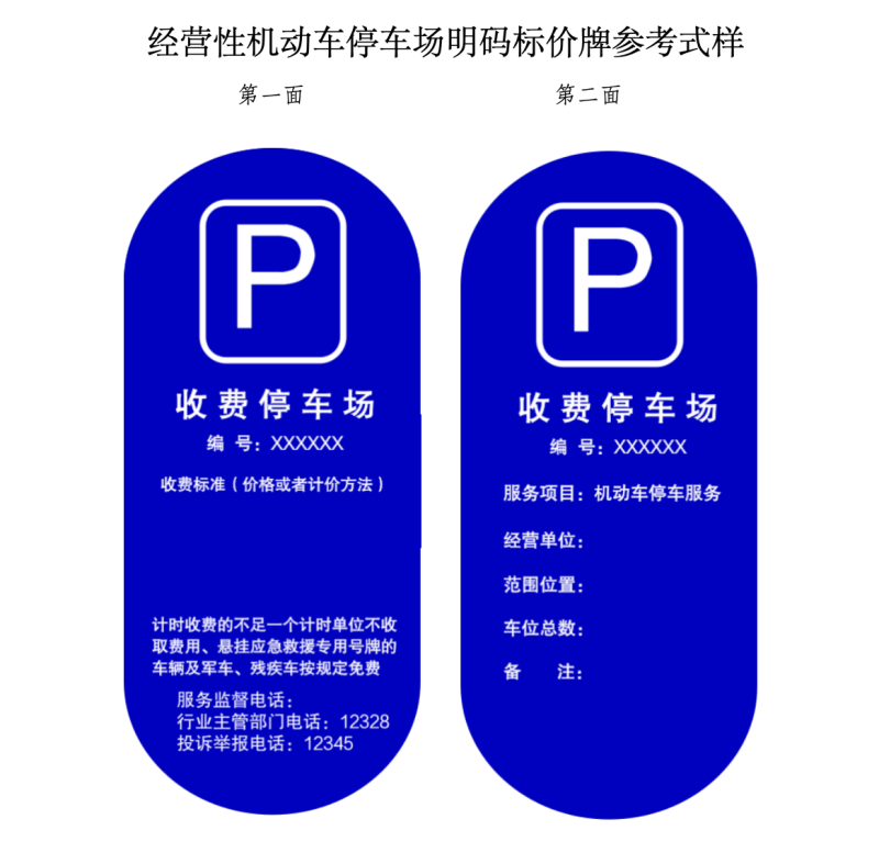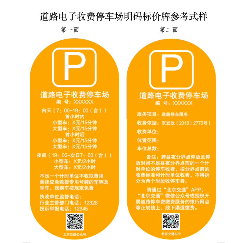根據(jù)相關(guān)法規(guī)政策的新要求,按照依法合規(guī)、便民利民、不做大改的原則,征求意見稿對兩種機動車停車場明碼標(biāo)價牌參考式樣進(jìn)行了修改完善,并附上“經(jīng)營性機動車停車場明碼標(biāo)價牌參考式樣”和“道路電子收費停車場明碼標(biāo)價牌參考式樣”,供相關(guān)單位參照自行制作明碼標(biāo)價牌,明碼標(biāo)價牌編號為北京市公共停車場經(jīng)營備案證的備案號。