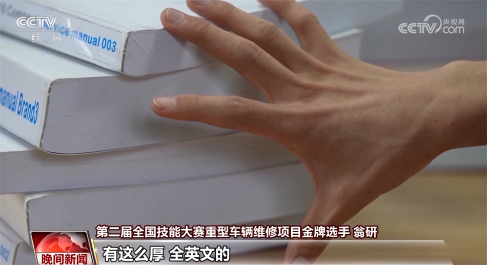 第二屆全國(guó)技能大賽重型車輛維修項(xiàng)目金牌選手 翁研:其實(shí)這次比賽的車型在一個(gè)月前才公布,而且全都是全新的車型,像我們比賽的資料(一個(gè)模塊)有2700多頁(yè),這么厚,全英文的。