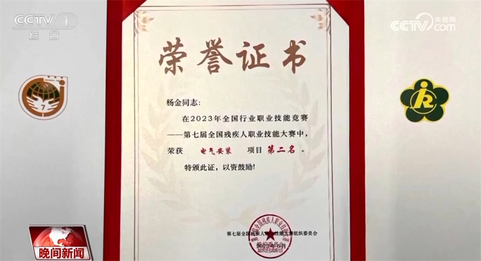 今年,在取得第七屆全國(guó)殘疾人職業(yè)技能大賽參賽資格后,楊金每天都堅(jiān)持12小時(shí)的高強(qiáng)度訓(xùn)練,最終在電氣安裝項(xiàng)目上拿到了銀牌。