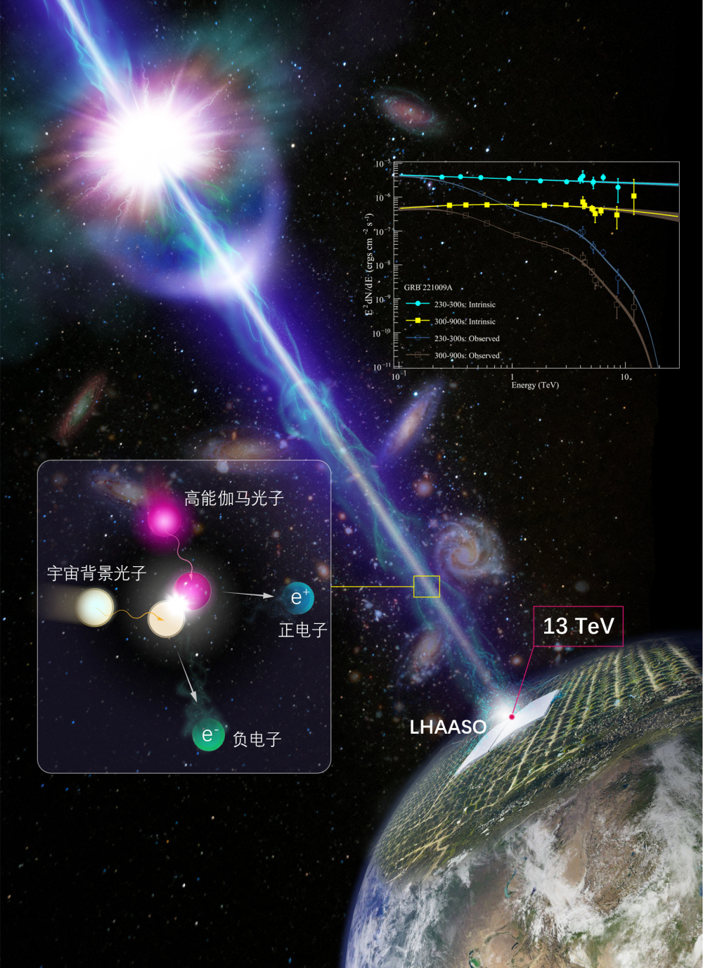 高能伽馬光子在飛行時會被宇宙中彌漫的背景光吸收,伽馬光子能量越高,被吸收得越強(qiáng)烈。反過來,根據(jù)伽馬射線被吸收的程度,也可以研究宇宙背景光的強(qiáng)度與性質(zhì)。GRB 221009A的極高亮度使我們有機(jī)會探測到來自24億光年外宇宙深處所產(chǎn)生的高能伽馬光子,這一結(jié)果將促使人們重新考慮宇宙中星系的形成和演化過程。