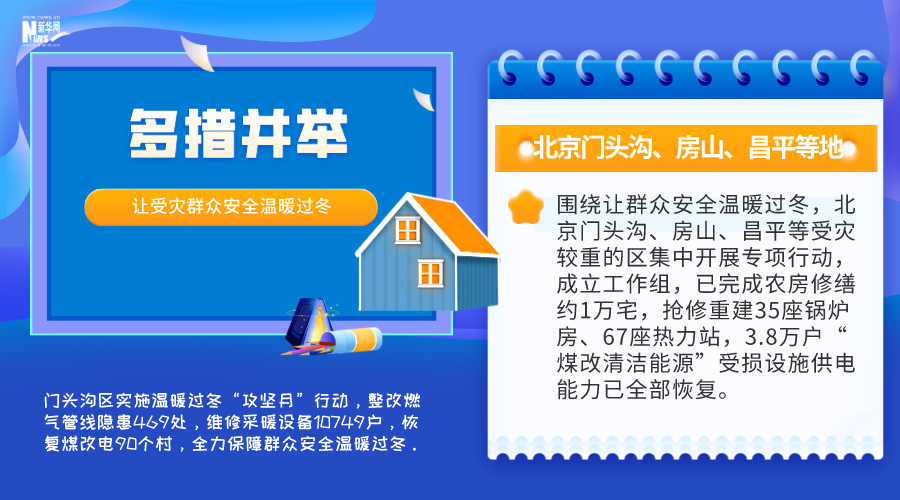 圍繞讓群眾安全溫暖過冬,北京門頭溝、房山、昌平等受災(zāi)較重的區(qū)集中開展專項行動,成立工作組,已完成農(nóng)房修繕約1萬宅,搶修重建35座鍋爐房、67座熱力站,3.8萬戶“煤改清潔能源”受損設(shè)施供電能力已全部恢復(fù)。