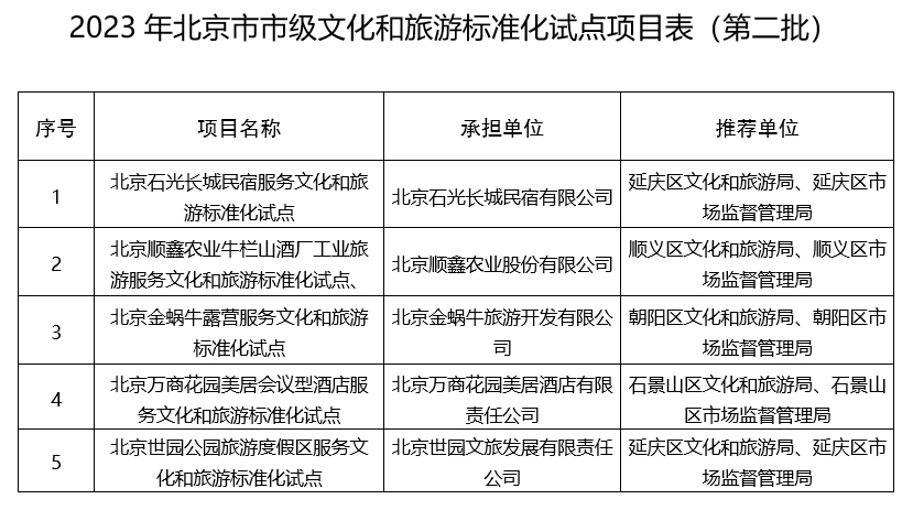 2023年北京市市級文化和旅游標準化試點項目表(第二批):