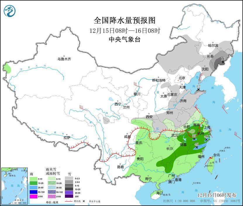 12月15日08時至16日08時,西北地區(qū)東南部、內(nèi)蒙古東部、東北地區(qū)中東部和南部、黃淮、江淮大部、江漢等地部分地區(qū)有小雪或雨夾雪,其中,吉林東部、遼寧東北部、山東北部等地部分地區(qū)有中到大雪,局地暴雪(10~12毫米)。江南、西南地區(qū)東部、華南、臺灣島等地部分地區(qū)有小到中雨,其中,江西北部、浙江中南部、福建北部等地部分地區(qū)有大雨(25~45毫米)。內(nèi)蒙古西南部、遼東半島、江蘇北部等地部分地區(qū)有4~6級風(fēng),其中,青海南部部分地區(qū)有6~7級風(fēng)。