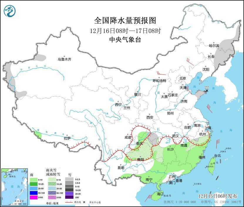 12月16日08時至17日08時,新疆南疆西部山區(qū)、東北地區(qū)東部、山東半島、湖南西部、浙江中部、貴州等地部分地區(qū)有小雪或雨夾雪,其中,山東半島等地部分地區(qū)有中到大雪,局地暴雪或大暴雪(20~22毫米)。湖南東部和南部、江西大部、浙江南部、福建、華南大部、臺灣島等地部分地區(qū)有小雨。內(nèi)蒙古中東部、山東北部、廣東西南部沿海等地部分地區(qū)有4~6級風(fēng)。