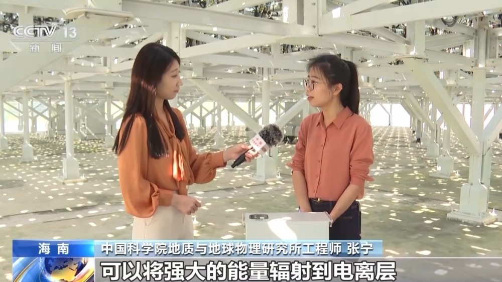 中國科學院地質與地球物理研究所工程師 張寧:通過8320個組件可以將強大的能量輻射到電離層,然后電離層會散射微弱的回波信號。然后我們通過低噪聲放大和波形的編解碼,可以對微弱的散射信號進行分析,得到電離層的參數(shù),將電離層中電子和離子的狀態(tài),像顯微鏡一樣放大給科學家。