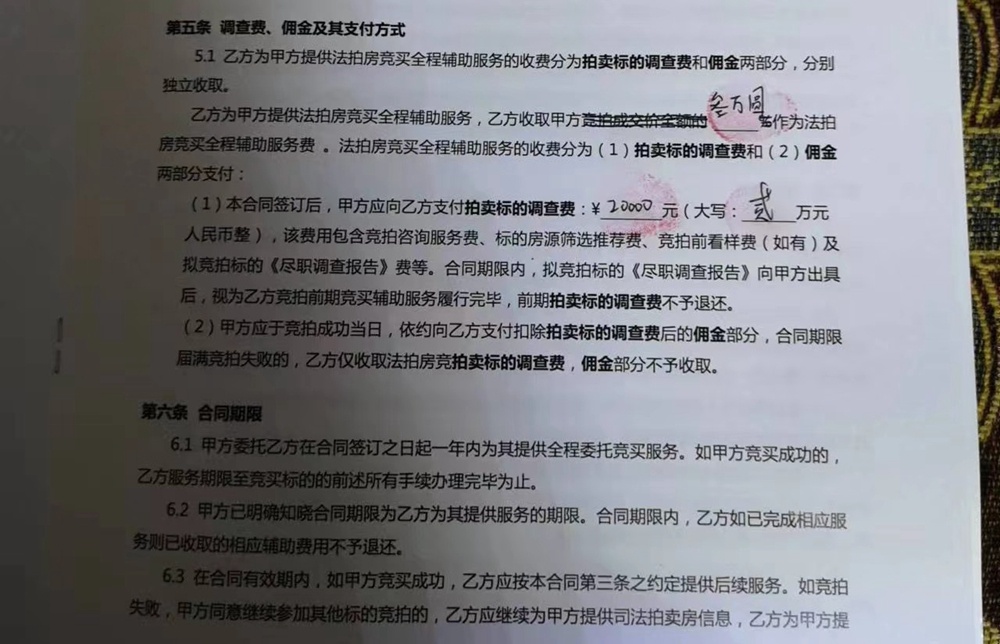 最終,中介口中30萬出頭就可以拿下的房子,被加價到了39萬,李先生放棄了競拍。他算了一筆賬,按最終成交價再加上各種費用,這套法拍房不低于同戶型的二手房價格。房子沒拍到,之前交的兩萬元“調(diào)查費”也打了水漂。在李先生給記者提供的雙方合同中,有這樣的約定:“合同期限內(nèi),擬競拍標的《盡職調(diào)查報告》向甲方出具后,視為乙方競拍前期競買輔助服務履行完畢,前期拍賣標的‘調(diào)查費’不予退還”。