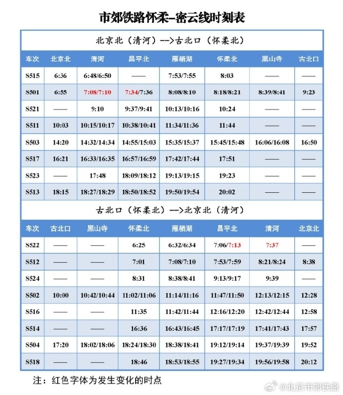 中新網(wǎng)1月9日電 據(jù)北京市郊鐵路官方微博消息,2024年1月10日起,北京市郊鐵路懷柔-密云線列車開行時點(diǎn)調(diào)整,具體列車時刻表如下圖所示: