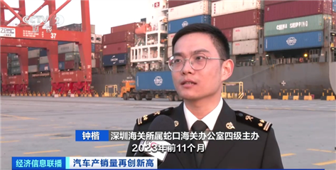 深圳海關(guān)所屬蛇口海關(guān)辦公室四級主辦 鐘楷:疊加提前申報抵港直裝,最大程度為企業(yè)降本提速。2023年前11個月,深圳市一共出口小汽車206.3億元,同比增長2倍多;其中電動載人汽車190.8億元,占汽車出口總值的92.5%。