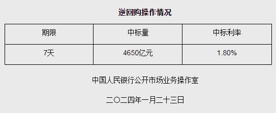 中新網(wǎng)1月23日電 據(jù)央行網(wǎng)站消息,為維護銀行體系流動性合理充裕,2024年1月23日人民銀行以利率招標方式開展了4650億元逆回購操作,中標利率1.80%,期限為7天。具體情況如下: