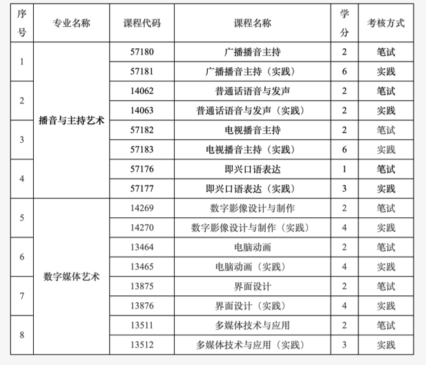 3. 調(diào)整播音與主持藝術(shù)專業(yè)(專升本)、數(shù)字媒體藝術(shù)專業(yè)(專升本)2個專業(yè)中8門課程(見下表),筆試和實踐均納入到“非筆試及實踐類課程”進(jìn)行報考,由主考學(xué)校組織考試。