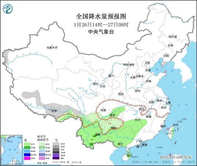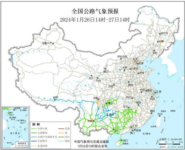 預(yù)計(jì)1月26日14時(shí)至27日14時(shí),西藏南部、四川南部、貴州中北部、云南東北部等地部分道路受小到中雪或雨夾雪影響;重慶、云南、貴州南部、廣西、湖南中南部、江西中部等地部分道路受小到中雨影響;貴州西部等地部分道路受凍雨影響。另外,吉林中部、四川中東部、云南中部、新疆西北部等地局部道路受霧影響能見(jiàn)度低。