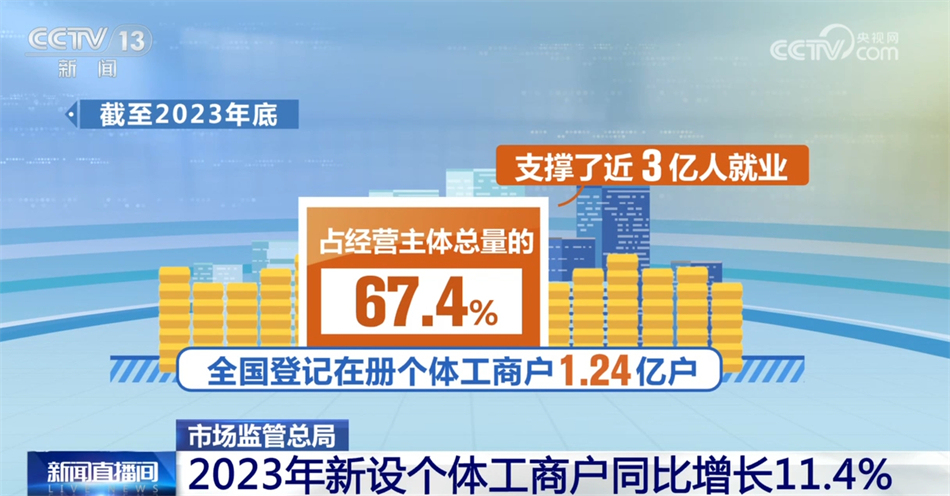 截至2023年底,全國(guó)登記在冊(cè)個(gè)體工商戶1.24億戶,占經(jīng)營(yíng)主體總量的67.4%,支撐了近3億人就業(yè);全年新設(shè)個(gè)體工商戶2258.2萬戶,同比增長(zhǎng)11.4%。