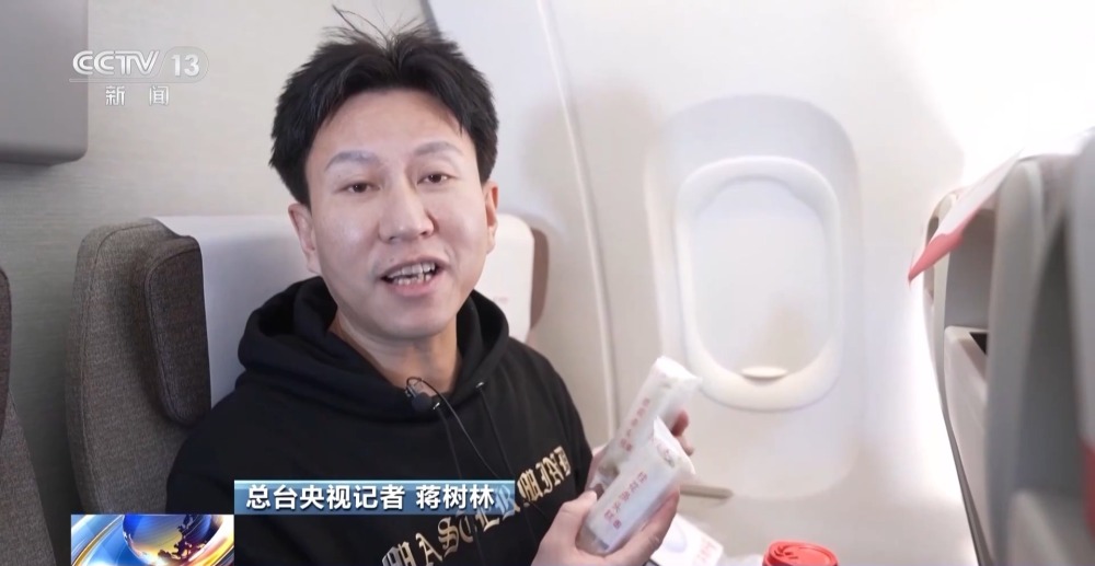 總臺央視記者 蔣樹林:首先是這個(gè)大白兔的紅豆風(fēng)味的牛奶,這還是我頭一次看到這樣的口味。還有這個(gè)桂花條頭糕,是上海老字號出產(chǎn)的??梢哉f這個(gè)小小的餐盤把上海的土特產(chǎn),搬到了C919飛機(jī)上。