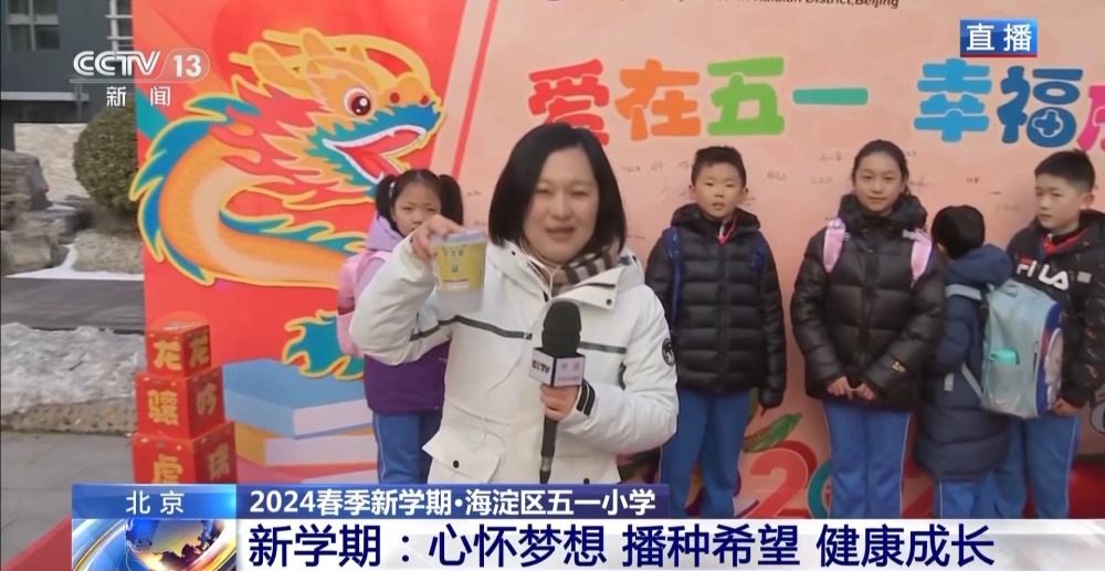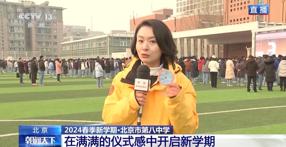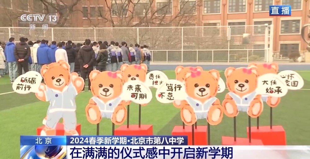 總臺(tái)央視記者 李晶晶:北京市第八中學(xué)高中部,近2300名高中生齊聚國(guó)旗下,舉行新學(xué)期的第一次升旗儀式,在滿滿的儀式感中開啟新的學(xué)習(xí)生活。今年是龍年,有句祝福語叫“龍行龘龘,前程?hào)T朤”,現(xiàn)在正在進(jìn)行的國(guó)旗下的演講,題目就是《龘龘朤朤間是向上的力量》,老師祝福學(xué)生們像龍一樣騰飛而上,同時(shí)也是鼓勵(lì)他們要有夢(mèng)想,為實(shí)現(xiàn)夢(mèng)想不斷努力向上。