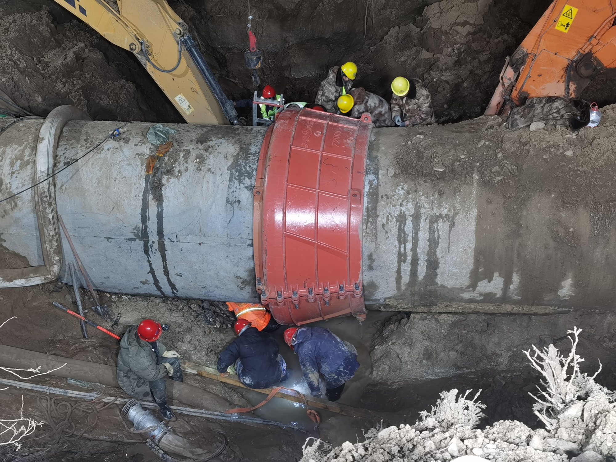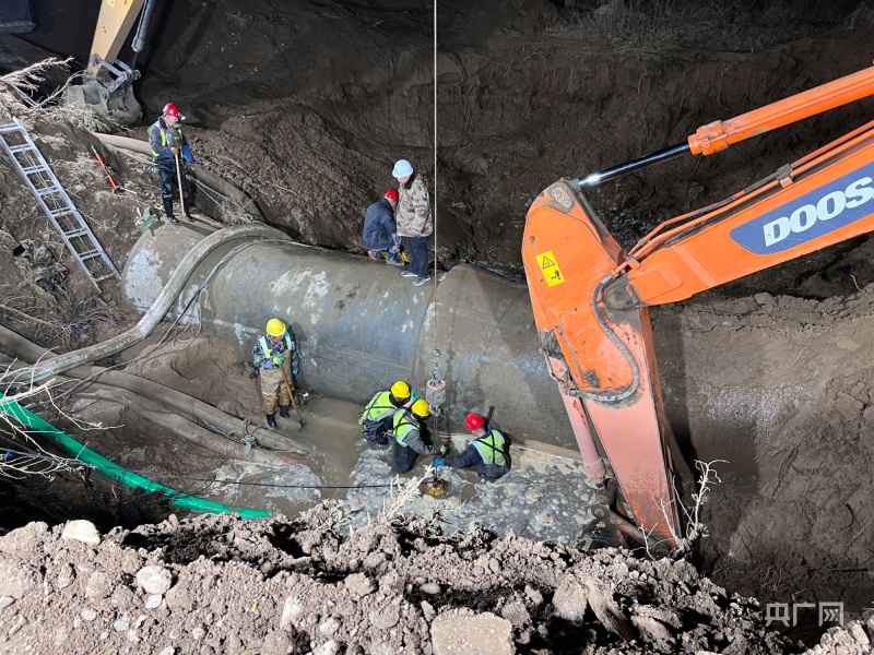 張文偉說:“因?yàn)檫@個(gè)管道是個(gè)兩米直徑的供水管線,是個(gè)主管線,它破裂以后水量特別大。管線是在耕地上,維修車輛是進(jìn)不去的。維修首先得修筑施工通道,所有車輛人員靠近不了,然后關(guān)閘停水,走施工通道過去以后,進(jìn)行原有管道抽排,管道里都是滿水,必須把水排干凈才能搶修,才能發(fā)現(xiàn)它是哪兒壞了,我們采取哪種方式來進(jìn)行搶修。搶修方案有很多種,我們也提前都有預(yù)案。所以抽水時(shí)間很長,上游就有7萬多立方的水,抽排就是一個(gè)很大的難點(diǎn)?!?/p>