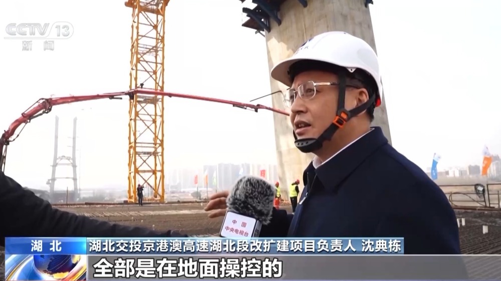 湖北交投京港澳高速湖北段改擴(kuò)建項目負(fù)責(zé)人 沈典棟:這個塔頂上就是輕型智能筑塔機(jī),是采用智能建造的技術(shù),全都是在地面操控的,塔上無人,這樣就保證了我們工人安全。我們這個智能的布料系統(tǒng),布料很均勻,讓混凝土不產(chǎn)生離析。
