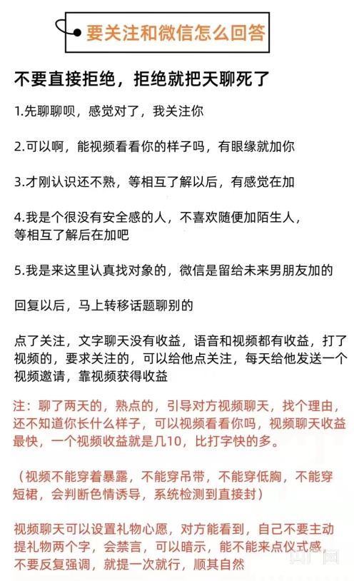 記者注意到,“使用手冊”第一頁聲明中稱,只參與軟件推廣,不涉及套路教學(xué)、虛假聊天、誘導(dǎo)充值。當(dāng)記者對是否能賺到錢表示擔(dān)憂時(shí),該推廣員發(fā)來一份“社交聊天日入千元攻略”,包含怎樣設(shè)置頭像、如何引導(dǎo)對方視頻聊天、如何拒加微信等信息。
