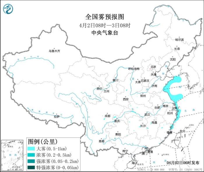 預(yù)計(jì),4月2日白天,黃海中西部海域、山東半島東部和南部沿岸海域、浙江沿岸海域?qū)⒂心芤姸炔蛔?公里的大霧。此外,4月2日傍晚至3日早晨,黃海西南部海域、江蘇中部和南部沿岸海域、長江口附近海域、杭州灣附近海域、浙江中北部沿岸海域?qū)⒂心芤姸炔蛔?公里的大霧。中央氣象臺(tái)4月2日06時(shí)繼續(xù)發(fā)布大霧黃色預(yù)警。