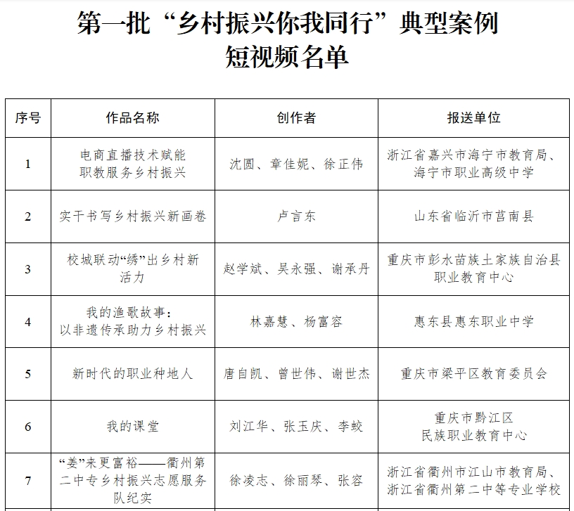 通知稱(chēng),根據(jù)《教育部辦公廳關(guān)于開(kāi)展“鄉(xiāng)村振興你我同行”典型案例短視頻征集與宣傳活動(dòng)的通知》(教職成廳函〔2023〕1號(hào))要求,經(jīng)各地申報(bào)、網(wǎng)絡(luò)投票、專(zhuān)家評(píng)議、公示,現(xiàn)公布第一批“鄉(xiāng)村振興你我同行”典型案例短視頻名單。