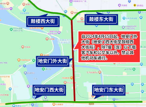 為確保全國(guó)重點(diǎn)文物保護(hù)單位“大運(yùn)河——玉河故道(澄清上閘含萬(wàn)寧橋)”的文物安全與交通安全,根據(jù)文物保護(hù)和道路交通安全有關(guān)法律法規(guī)規(guī)定,決定自2024年4月15日起,地安門外大街(地安門西大街至鼓樓西大街段),除7座(含)以下載客汽車和公交車以外,禁止其他機(jī)動(dòng)車通行。
