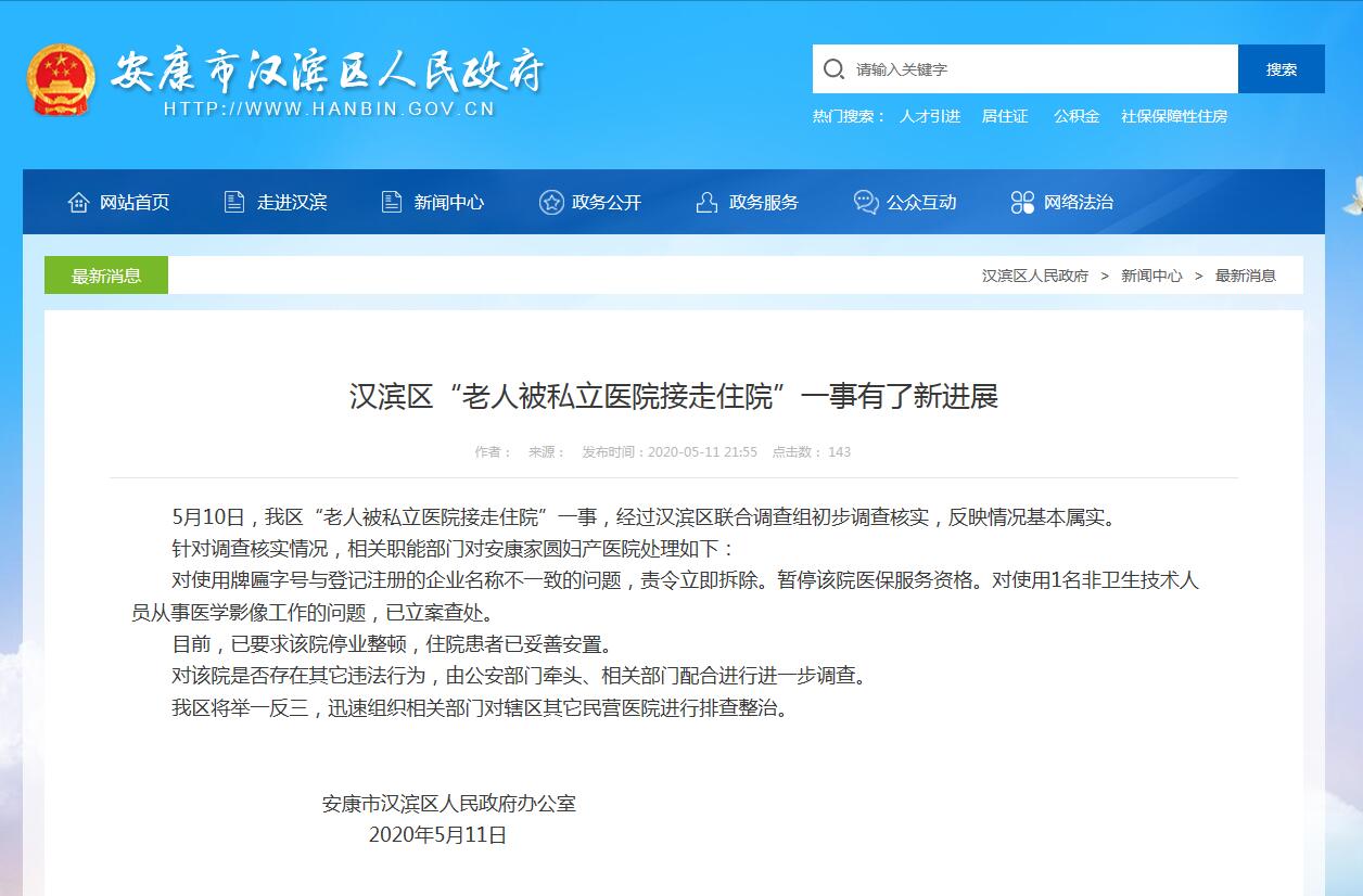 中新網(wǎng)5月12日電 據(jù)陜西安康市漢濱區(qū)人民政府網(wǎng)站消息,對于安康市漢濱區(qū)“老人被私立醫(yī)院接走住院”一事,經(jīng)漢濱區(qū)聯(lián)合調(diào)查組初步調(diào)查核實,反映情況基本屬實。目前,已要求該院停業(yè)整頓,住院患者已妥善安置。