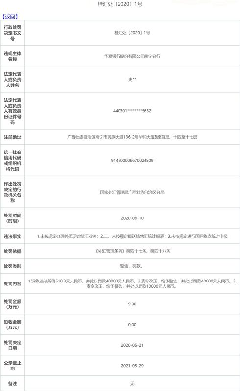 華夏銀行南寧分行三宗違法遭罰 違規(guī)辦理外幣現(xiàn)鈔結(jié)匯