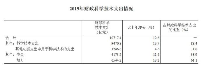 2019年,國家財政科學(xué)技術(shù)支出10717.4億元,比上年增加1199.2億元,增長12.6%。其中,中央財政科學(xué)技術(shù)支出4173.2億元,增長11.6%,占財政科學(xué)技術(shù)支出的比重為38.9%;地方財政科學(xué)技術(shù)支出6544.2億元,增長13.2%,占比為61.1%。
