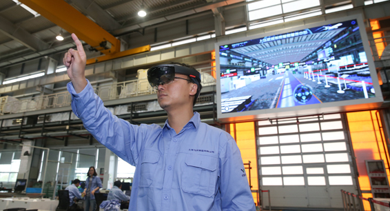 中國(guó)商飛公司總裝制造中心智慧數(shù)控車間主要承擔(dān)飛機(jī)零部件的研制、生產(chǎn)工作,其產(chǎn)品用于C919大型客機(jī)、ARJ21新支線客機(jī)。圖為工作人員在中國(guó)商飛公司總裝制造中心智慧數(shù)控車間使用AR眼鏡操控虛擬電子屏幕。新華社記者 丁汀 攝