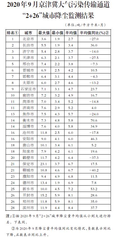 生態(tài)環(huán)境部今日向媒體公布了2020年9月京津冀大氣污染傳輸通道“2+26”城市(以下簡稱“2+26”城市)和汾渭平原11城市降塵監(jiān)測結(jié)果。