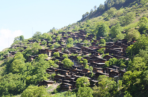 依山而建的木楞房錯落有致地密布在半山腰上,村口整齊停放著一輛輛貨車、小汽車和摩托車,通往各家的小路干凈整潔。