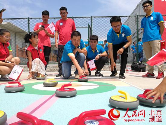 “海坨之星”地壺球隊(duì)的小隊(duì)員們,和冬奧工程一線建設(shè)者們一起打了一場充滿歡聲笑語的友誼地壺球賽。人民網(wǎng)尹星云 攝