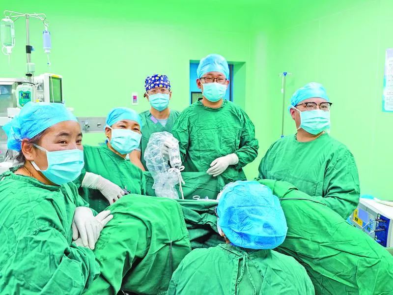 上海援藏醫(yī)療專家隋孟松(右一)帶領本地婦科醫(yī)生開展日喀則市首例腹腔鏡下全子宮切除手術。