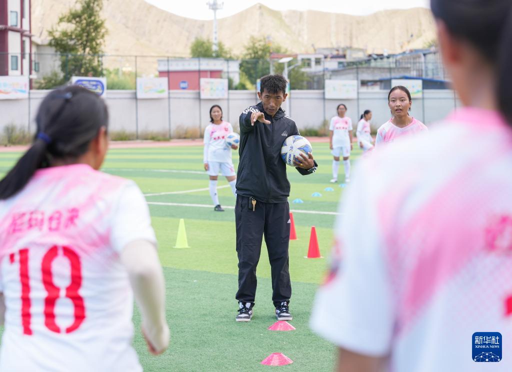 西藏日喀則市上海實(shí)驗(yàn)學(xué)校“珠峰雪鷹”女子足球隊(duì)教練王劍平(前)在操場上指導(dǎo)球員訓(xùn)練(9月3日攝)。