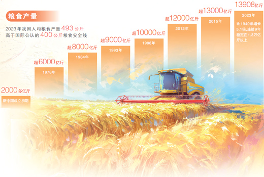 豐收成色十足?!安丶Z于地、藏糧于技”戰(zhàn)略深入實(shí)施,我國(guó)糧食綜合生產(chǎn)能力穩(wěn)步提升,連續(xù)9年穩(wěn)定在1.3萬(wàn)億斤以上。截至2023年,全國(guó)綠色、有機(jī)、名特優(yōu)新和地理標(biāo)志農(nóng)產(chǎn)品認(rèn)證登記總數(shù)達(dá)到7.5萬(wàn)個(gè)。蔬菜水果品種琳瑯滿目,居民的“菜籃子”“果盤子”更加豐富。