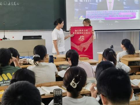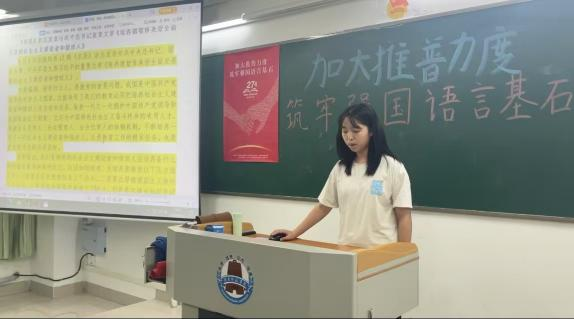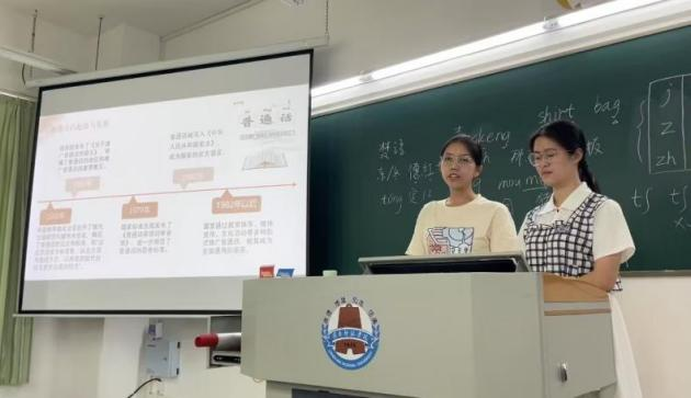 新學(xué)期伊始,《教師語言》課程教學(xué)團(tuán)隊將推普宣傳與課程的“音韻筑基”內(nèi)容相結(jié)合,理論層面講解我國通用語言文字的相關(guān)法律政策和普通話聲、韻、調(diào)等基礎(chǔ)知識;實(shí)踐層面指導(dǎo)學(xué)生利用中國語言文字?jǐn)?shù)字博物館、師圈小程序等課程資源進(jìn)行學(xué)習(xí),邀請學(xué)生介紹普通話的發(fā)展歷程和我國第27屆推普宣傳主題中所滲透的“強(qiáng)國必須強(qiáng)語,強(qiáng)語助力強(qiáng)國”價值內(nèi)涵。