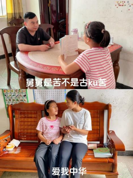 20級畢業(yè)生龍源天在清遠(yuǎn)市連州市龍坪鎮(zhèn)中心小學(xué)進(jìn)行推普創(chuàng)新實(shí)踐,指導(dǎo)學(xué)生借助手勢舞誦讀《古朗月行》,并將推普工作與家庭教育緊密結(jié)合,策劃與指導(dǎo)“普通話進(jìn)家庭”活動。小朋友們化身為普通話小老師,糾正家長的發(fā)音,與家長共同學(xué)習(xí)、共同進(jìn)步,提高了家長們的語言規(guī)范意識;親子同唱《愛我中華》經(jīng)典歌曲,讓推普成為家庭文化的一部分,家庭成員之間的情感得以加深,更在孩子們心中種下了愛國愛家的種子。