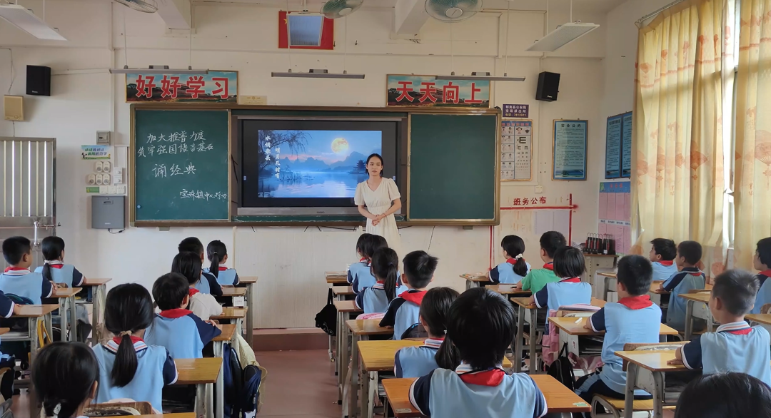 18級畢業(yè)生鐘凱祈和胡淼華分別指導(dǎo)云浮市郁南縣寶珠鎮(zhèn)中心學(xué)校四年級學(xué)生誦讀和唱誦《水調(diào)歌頭·明月幾時有》?;顒硬粌H鞏固了普通話基礎(chǔ)訓(xùn)練,豐富了孩子們的語言學(xué)習(xí)體驗(yàn),還通過多樣化的形式激發(fā)了他們對中華文化的興趣與熱愛,為他們的全面發(fā)展奠定了堅實(shí)的語言基礎(chǔ)。同時,這些活動也是師范畢業(yè)生們將所學(xué)知識回饋社會、服務(wù)鄉(xiāng)村教育的生動實(shí)踐,展現(xiàn)了新時代教育工作者的責(zé)任與擔(dān)當(dāng)。