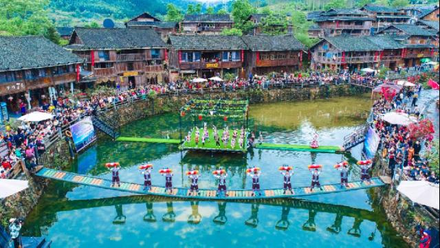 廣西投入中央財(cái)政少數(shù)民族發(fā)展資金1.6億元,打造民族村寨與鄉(xiāng)村旅游融合發(fā)展試點(diǎn)39個。圖為2024年4月廣西傳統(tǒng)民族節(jié)日“三月三”期間,來自全國的游客與夢嗚苗寨村民一起慶祝節(jié)日。廣西壯族自治區(qū)柳州市民宗委供圖