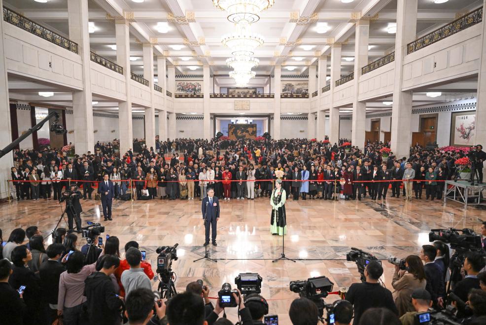 閉幕會(huì)前,人民大會(huì)堂中央大廳北側(cè),第三場“代表通道”集體采訪活動(dòng)正在進(jìn)行。