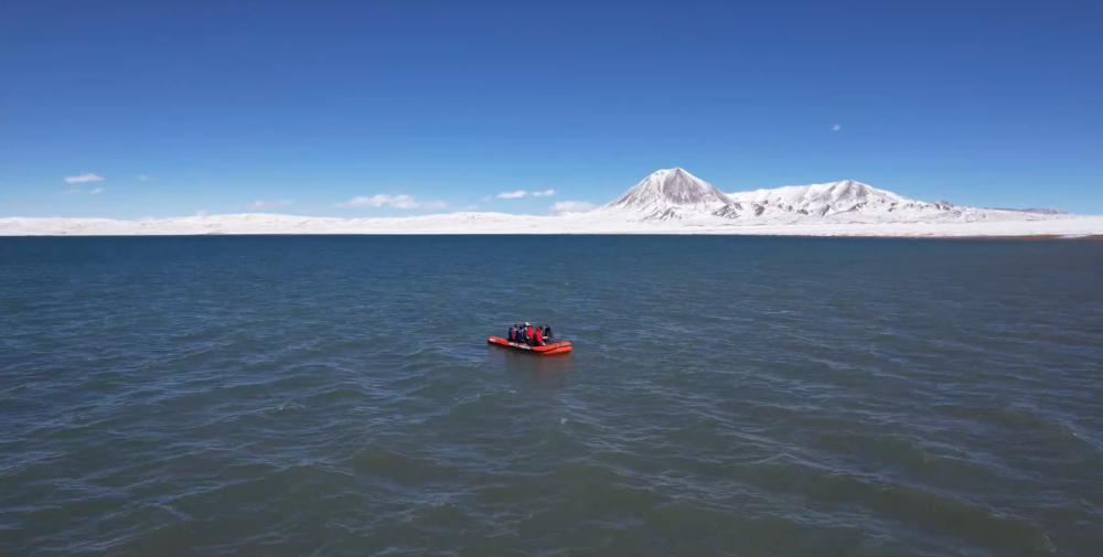 風(fēng)浪中,橡膠艇駛進(jìn)雀莫錯(cuò)湖心。小小的橡膠艇非常簡陋狹窄,三位中科院專家和我們兩名記者共五人擠著坐在船沿上,腳都伸展不開。暈船,風(fēng)浪這些全都顧不得了。我一只手拿著麥克,一只手緊緊攥住橡膠艇的邊緣,抓緊一切時(shí)間采訪。