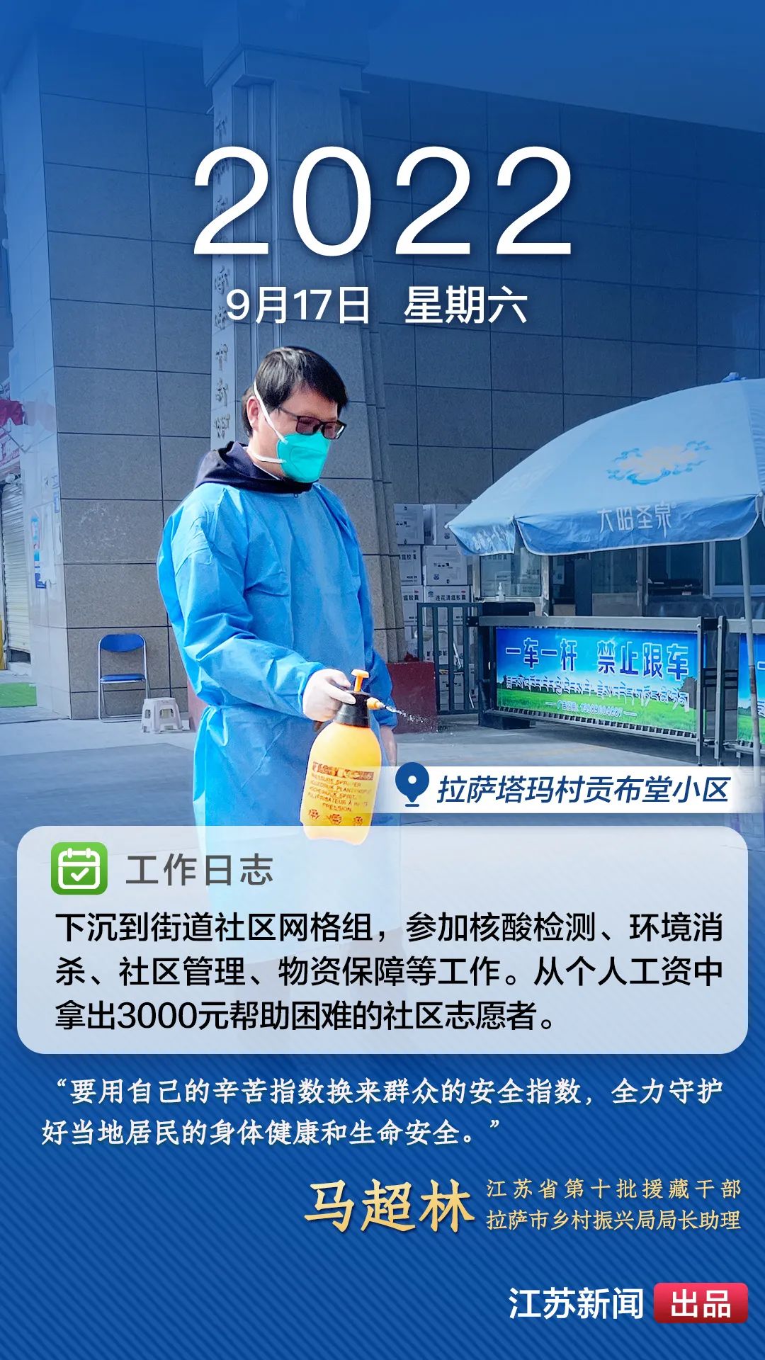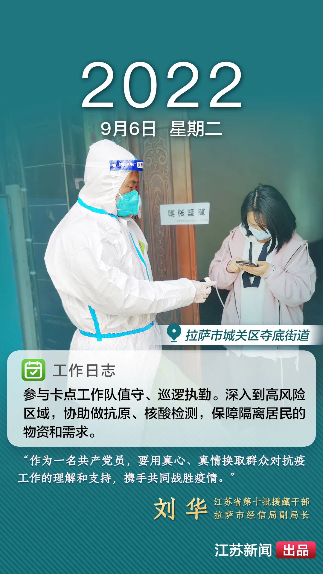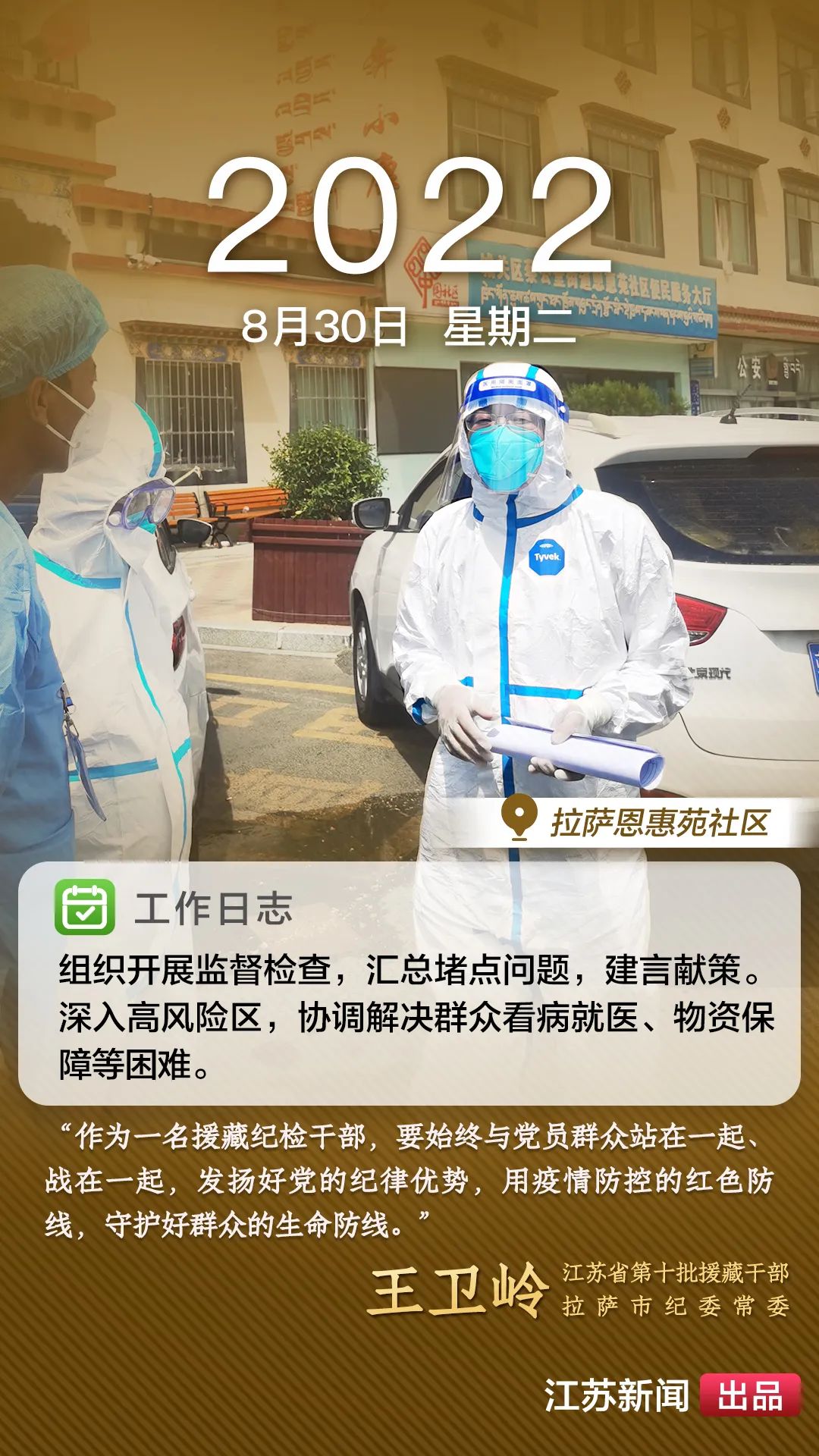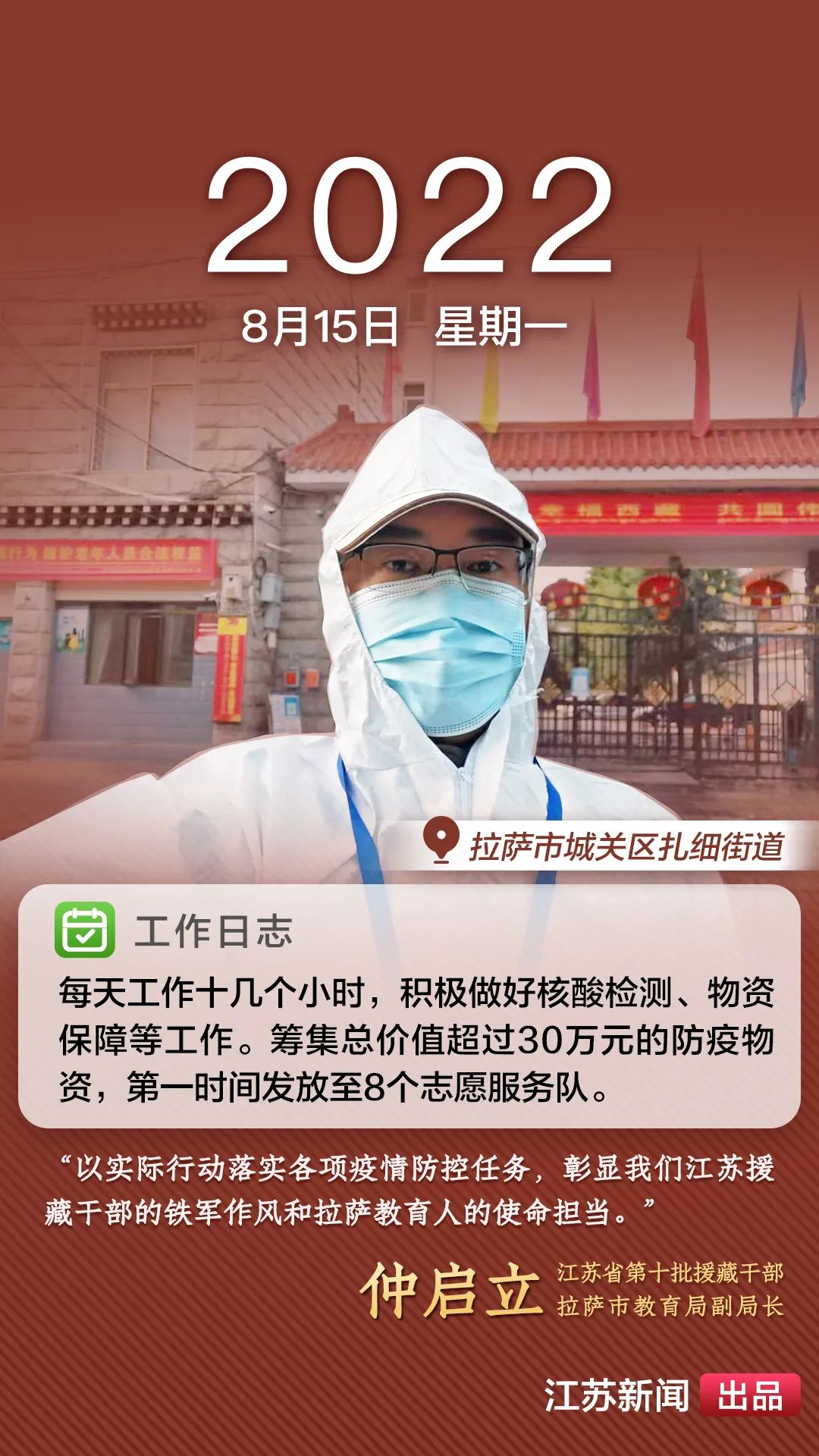 2022年8月,一場突如其來的新冠肺炎疫情襲擊拉薩。江蘇援藏前方指揮部樹立高度的政治意識(shí),堅(jiān)決貫徹江蘇省委、省政府主要領(lǐng)導(dǎo)批示精神和自治區(qū)、拉薩市部署要求,全力以赴做好疫情防控工作。第十批援藏干部人才克服初到高原的身體反應(yīng),服從服務(wù)大局、勇于擔(dān)當(dāng)作為,迅速投身疫情防控工作一線,以實(shí)際行動(dòng)展現(xiàn)江蘇援藏的鐵軍作風(fēng)。近期,我們將陸續(xù)推出江蘇援藏干部人才抗疫身影,敬請(qǐng)關(guān)注。