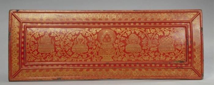 永樂(lè)版藏文《大藏經(jīng)》之紅漆戧金八吉祥紋經(jīng)文夾板(圖片來(lái)源:故宮博物院官網(wǎng))