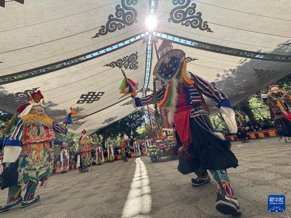 5月1日,拉薩市城關(guān)區(qū)娘熱民間藝術(shù)團在羅布林卡景區(qū)表演藏戲。新華社記者 洛卓嘉措 攝