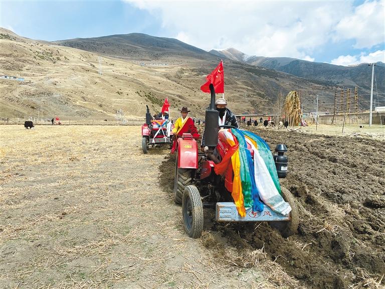 儀式現(xiàn)場(chǎng),農(nóng)牧民群眾身著節(jié)日盛裝,帶著哈達(dá)、酥油茶等聚齊在田間舉行開(kāi)犁儀式,祈禱全年風(fēng)調(diào)雨順、五谷豐登。懸掛著五星紅旗和黨旗的大型農(nóng)機(jī)具和拖拉機(jī)一字排開(kāi),在“轟隆隆”的響聲中,年輕的機(jī)手們開(kāi)動(dòng)拖拉機(jī)翻耕土地,婦女們熟練地躬身平土,土地逐漸變得平整松軟,一幅生機(jī)勃勃的“春耕畫(huà)卷”在加勤鄉(xiāng)的土地上徐徐展開(kāi)。