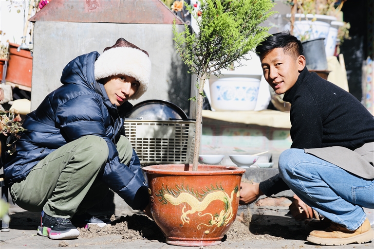 旦增特覺(jué)(右)和旦增格桑(左)正在移栽新買(mǎi)的青松樹(shù)。記者 格桑倫珠 央金 攝