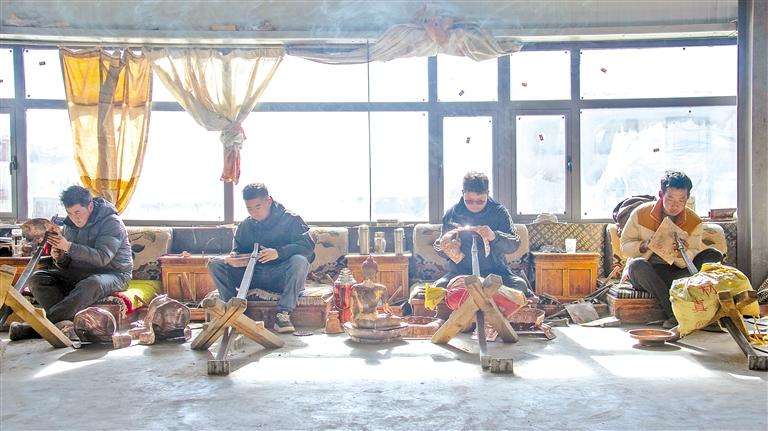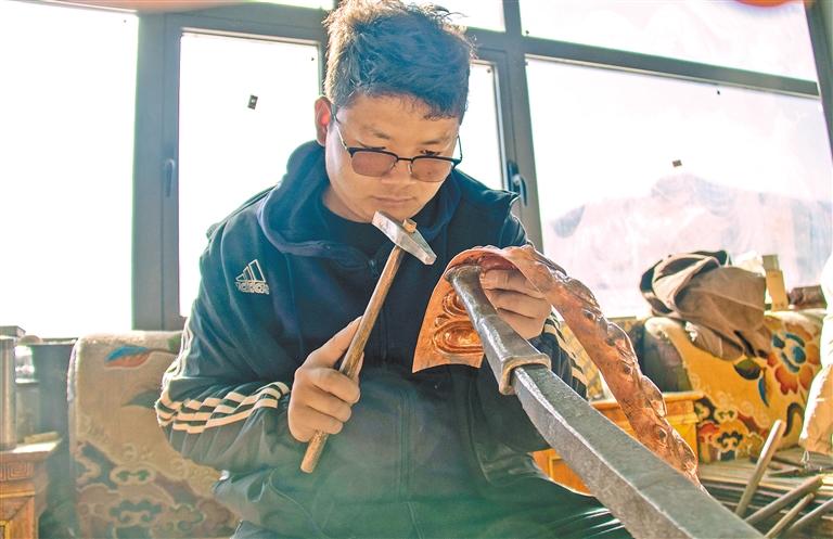南木林縣孜東銅器的手工藝人在作坊制作工藝品。記者 扎西頓珠 攝