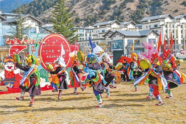 圖為來自巴宜區(qū)布久鄉(xiāng)的農牧民演出隊進行非遺“羌姆”表演。記者 劉楓 王珊 攝