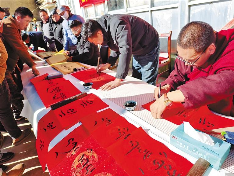 藏歷新年來臨之際,浪卡子縣浪卡子鎮(zhèn)農(nóng)牧民群眾齊聚一堂,舉行“蛇年新篇再起航 攜手并肩共奮斗”迎新年活動?;顒蝇F(xiàn)場,書法愛好者潑墨揮毫,根據(jù)群眾的需求,將對新年的美好祝愿融入一幅幅精美的春聯(lián)之中。