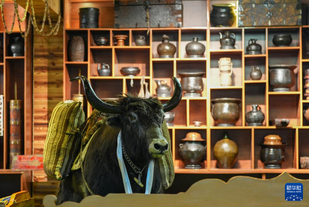 茶館主人珠珠將藏式茶館與民俗陳列方式相結(jié)合,讓顧客在品嘗美食的同時,沉浸式體驗民俗文化。茶館四周和過道上擺滿700余種3000多件西藏民俗物件,有給牛犢喂奶的牛角奶瓶、火柴盒大小的便攜酥油盒、防沙塵和雪盲的牦牛毛墨鏡等。牧民生產(chǎn)生活用具幾乎都能在這里找到,獨具風(fēng)格的茶館儼然成為一座藏北游牧文化“博物館”。