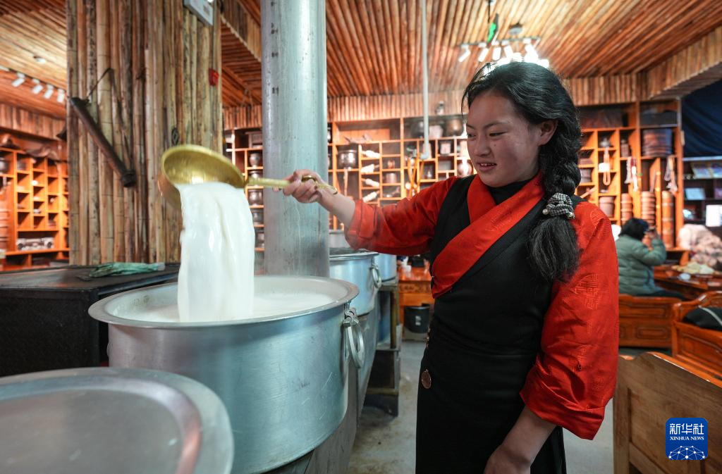 “牧人寶庫”藏式茶館服務(wù)員在熬制奶茶(2月13日攝)。新華社記者 晉美多吉 攝